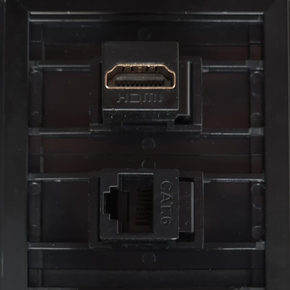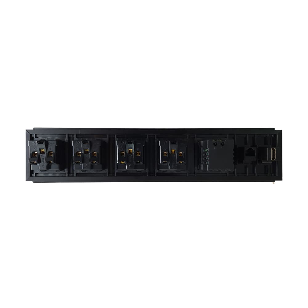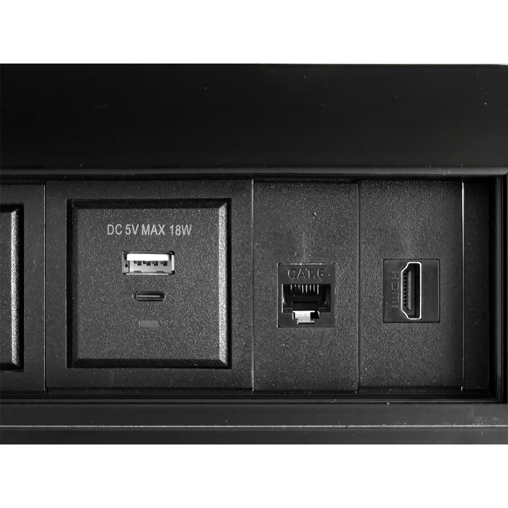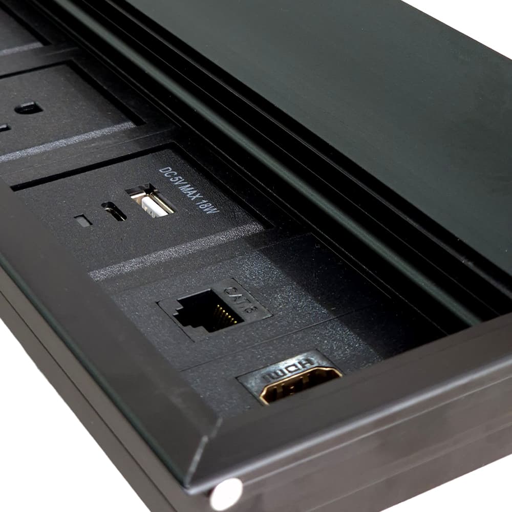 Caja de Conectividad Multipuerto Plus fabricada en aluminio con escobilla guarda polvo, ideal para salas de juntas, oficinas y estaciones de trabajo profesionales. Integra 4 tomas de corriente 110V, RJ45 CAT6, HDMI, USB Tipo C 18W y USB Tipo A, ofreciendo conectividad completa en un solo punto, con diseño elegante y funcional.
