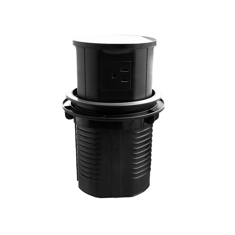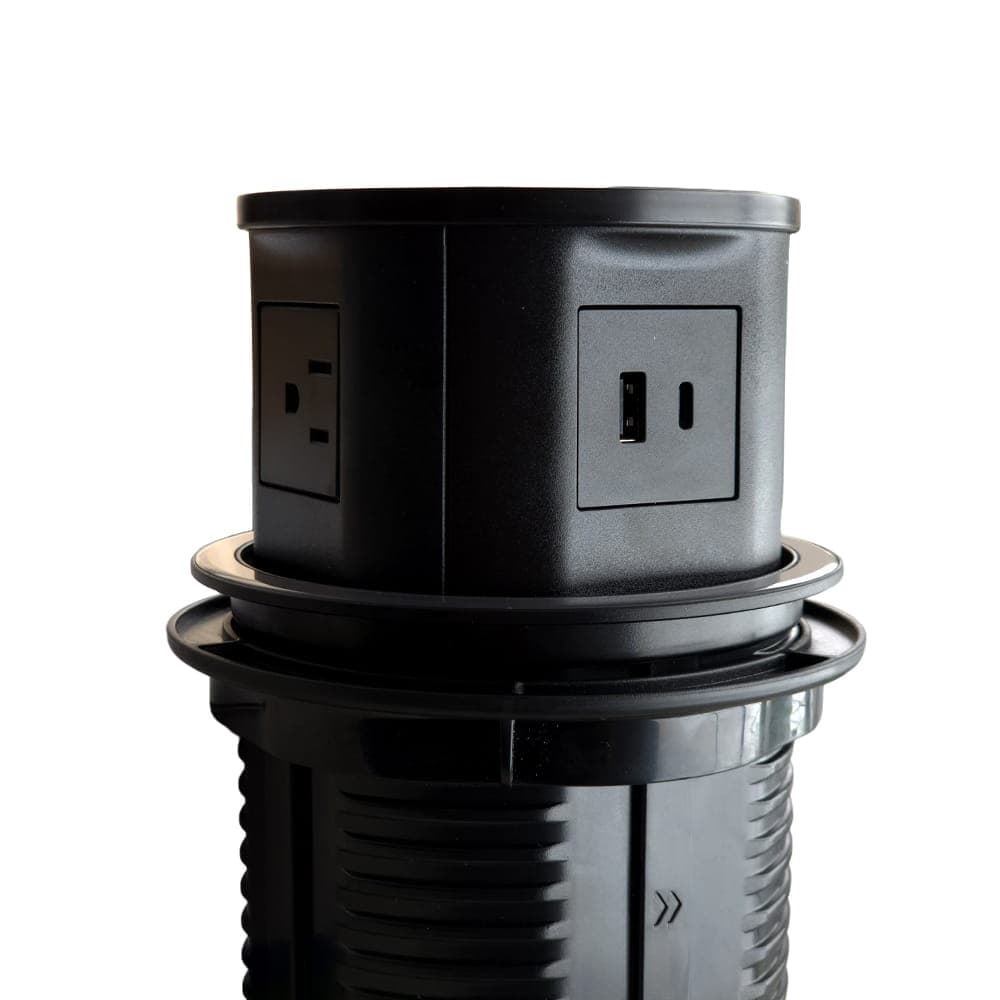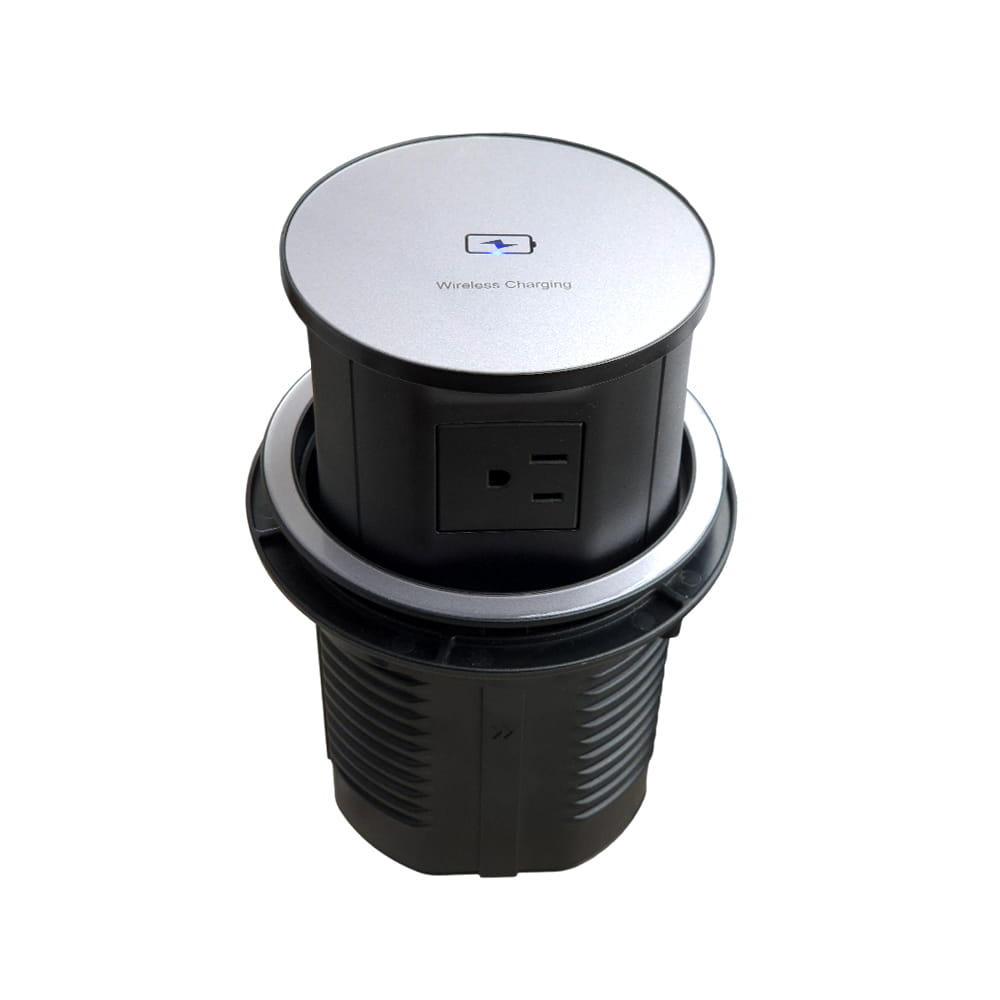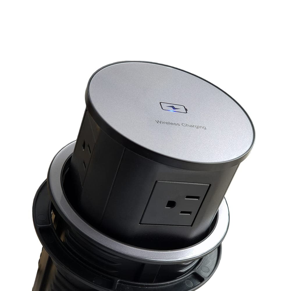 Grommet Pop Up con carga inalámbrica ideal para escritorios modernos y espacios de trabajo. Integra 3 tomas de corriente 110V, USB Tipo A QC 3.0, USB Tipo C y pad de carga inalámbrica, ofreciendo una solución práctica, elegante y segura para conectar y cargar múltiples dispositivos.