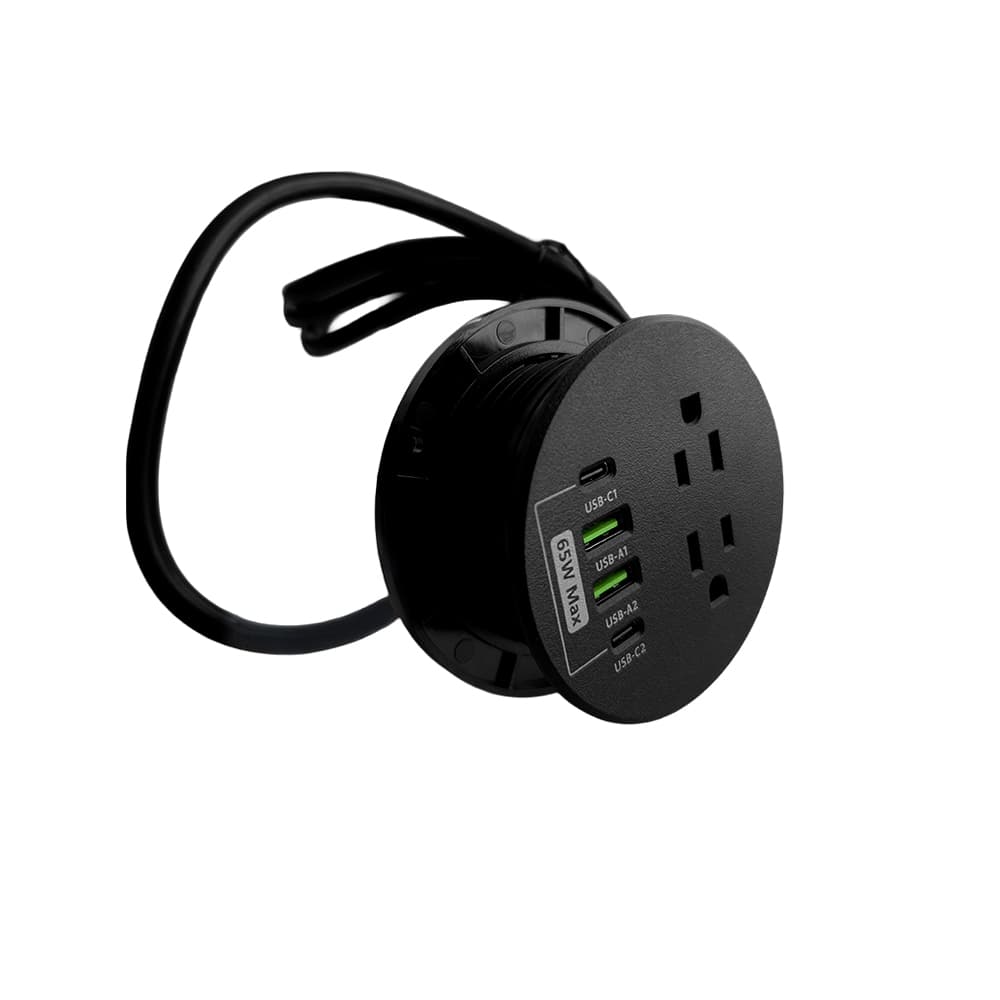 Grommet Redondo Max diseñado para escritorios modernos que requieren máxima potencia y conectividad. Cuenta con 2 tomas de corriente 110V, 2 puertos USB Tipo A con Quick Charge y 2 puertos USB Tipo C de hasta 65W, ideal para cargar laptops, tablets y dispositivos móviles de forma rápida y ordenada.