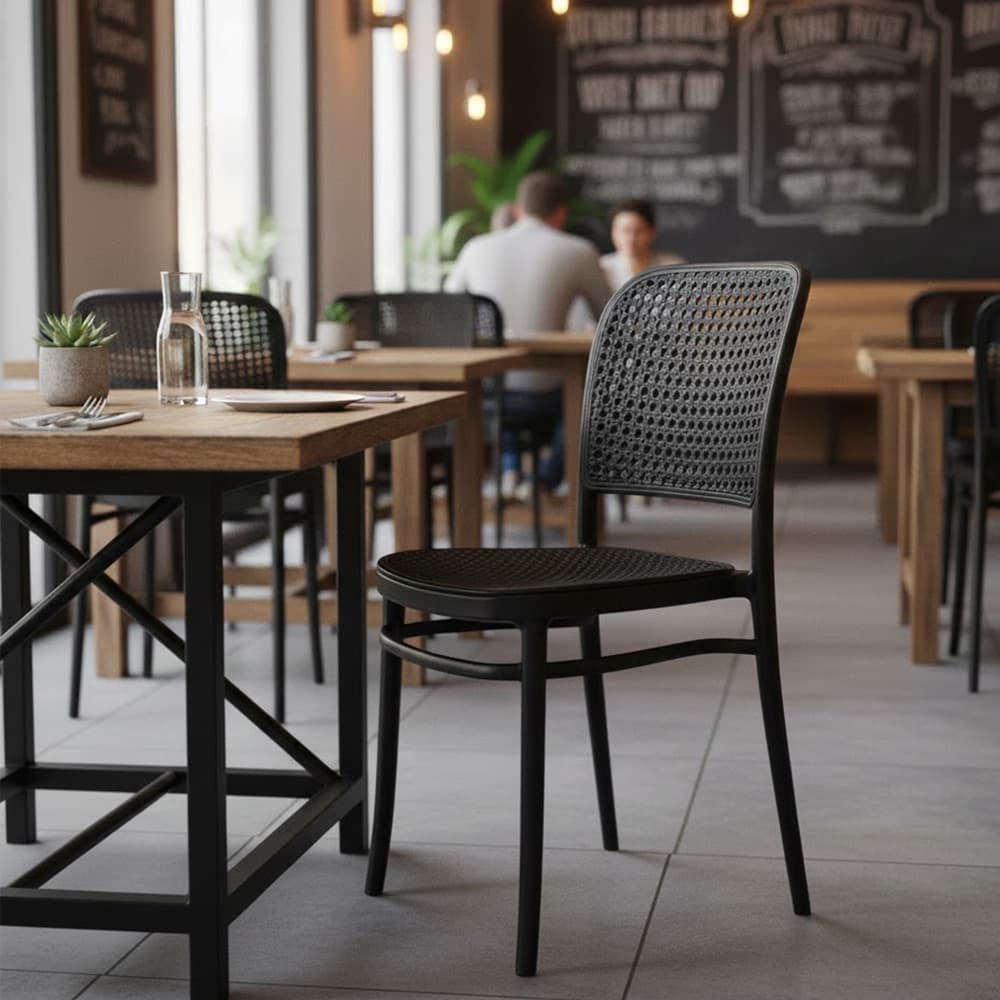 La Silla Plástica Amis Negra es una opción moderna, resistente y versátil para restaurantes, cafeterías, terrazas, comedores corporativos y espacios comerciales. Su diseño liviano con respaldo tipo rejilla ofrece una excelente ventilación y comodidad, mientras que su estructura en polipropileno de alta resistencia garantiza durabilidad en interiores y exteriores.